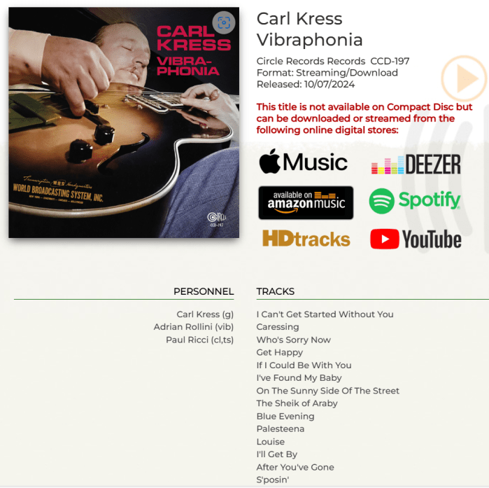 The tracks on the Kress record above can be found on an earlier CD produced 2005, named “Adrian Rollini Trio, Quartet and Quintet 1936-1947” (VMP: Vintage Music Productions)! This particular session was recorded as Adrian Rollini Quintet, 1938 (World Transcription Service). One track – “Caressing” is only on the new Kress record! The track “Palesteena” is titled “Untitled” on the Adrian Rollini record!