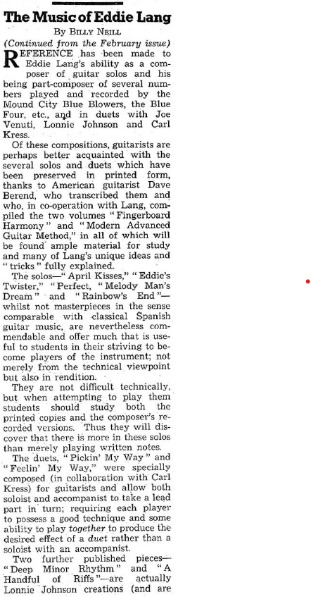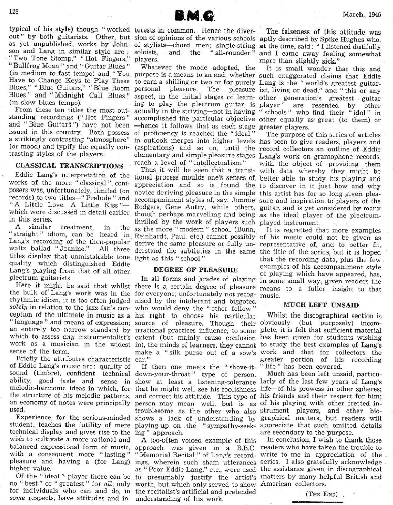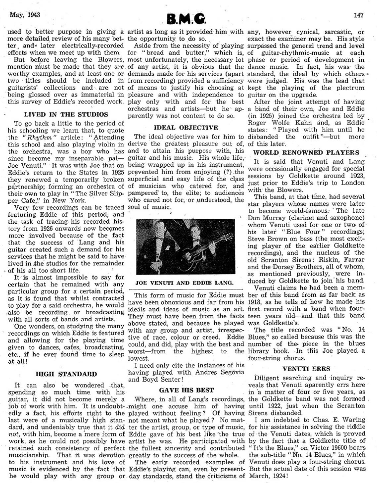 Eddie Lang biography & discography in British magazine “B(anjo)M(andolin)G(uitar)”, March 1943-March 1945! Lasting for 24 months (=24 issues, 1-2 pages per issue!), making it one of the most thorough and longlasting articles written on any guitarist in any magazine! Here I show only 7 pages!: