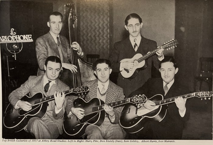 Three of the players in the guitar quintet mentioned above – Stutely, Harris, Mairants (picture from British music magazine “Melody Maker”, 1937).