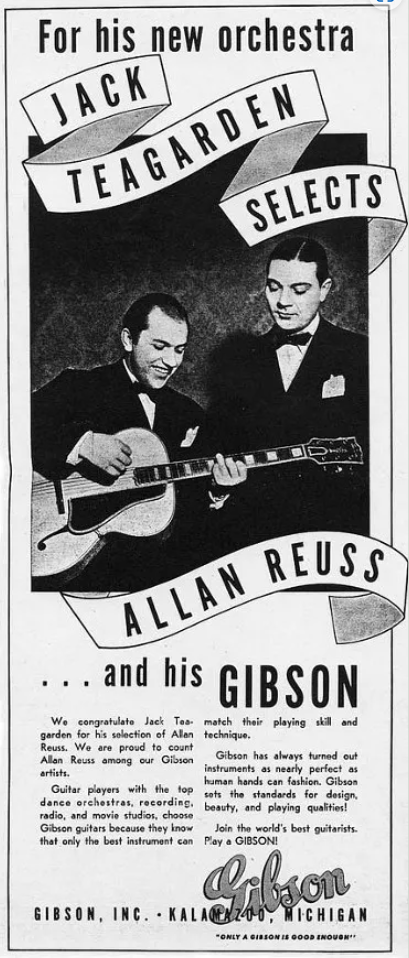 Reuss folio 1930-40´s (two of the compositions – “Apartment G” & “Pet Shop” written in 1938), Teagarden/Gibson ad Downbeat 1939, Gibson catalogue 1937