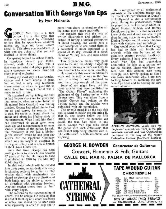 Mairants in conversation with George Van Eps 1970, British magazine “B(anjo)M(andolin)G(uitar”, Sept 1970)!: