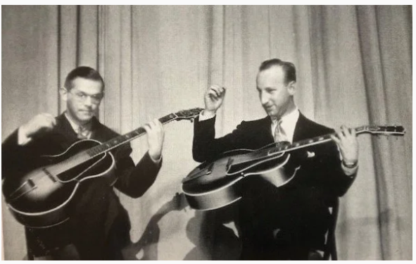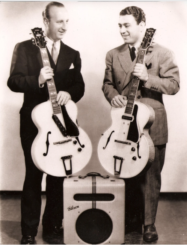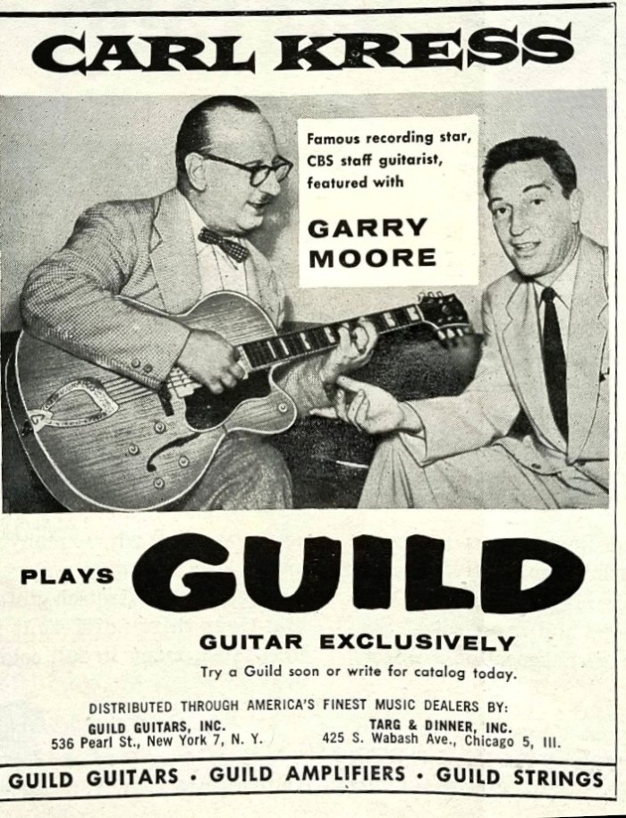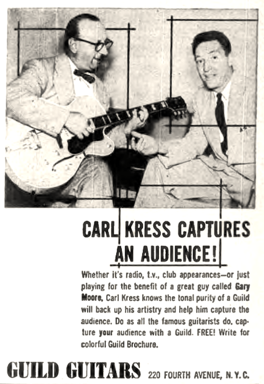 Kress / Mottola, photo for an ad to promote Gibson guitars & amplifiers, 1941-42; Carl Kress was a featured musician on Garry Moore’s popular television variety show, The Garry Moore Show, during the 1950s in USA (TV-show running 1950-1958).