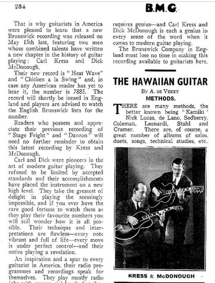 Article in British magazine “B(anjo)M(andolin)G(uitar)”, on the release of Kress/McDonough duet record “Heat Wave”/”Chicken a la Swing”, July 1937!: