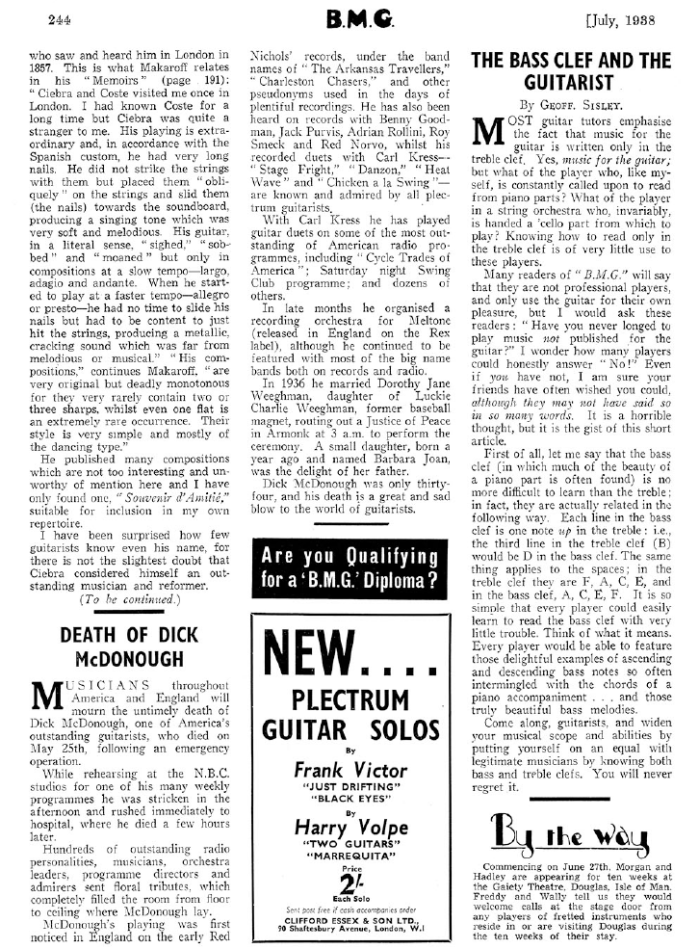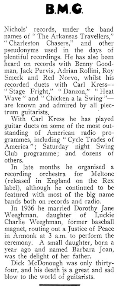 Dick McDonough obituary, in British magazine “B(anjo)M(andolin)G(uitar)”, July 1938: