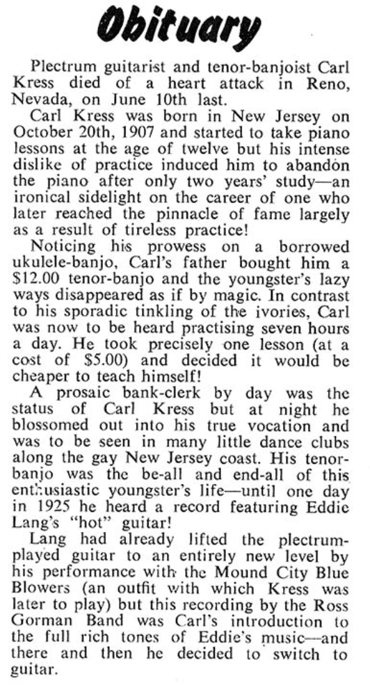 Kress obituary in British magazine “B(anjo)M(andolin)G(uitar)”, Aug 1965: