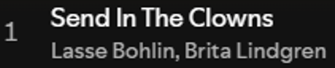 “Send In The Clowns” (Stephen Sondheim); recorded at the jazz club “Nefertiti”, Gothenburg, May 1986. Vocals by Brita Lindgren (Spotify link – Brita). Recording taken from cassette tape, made by the club´s sound technician – two microphones at the club mixer board. Guitar – Squire Stratocaster: Spotify link – “Send In The Clowns”