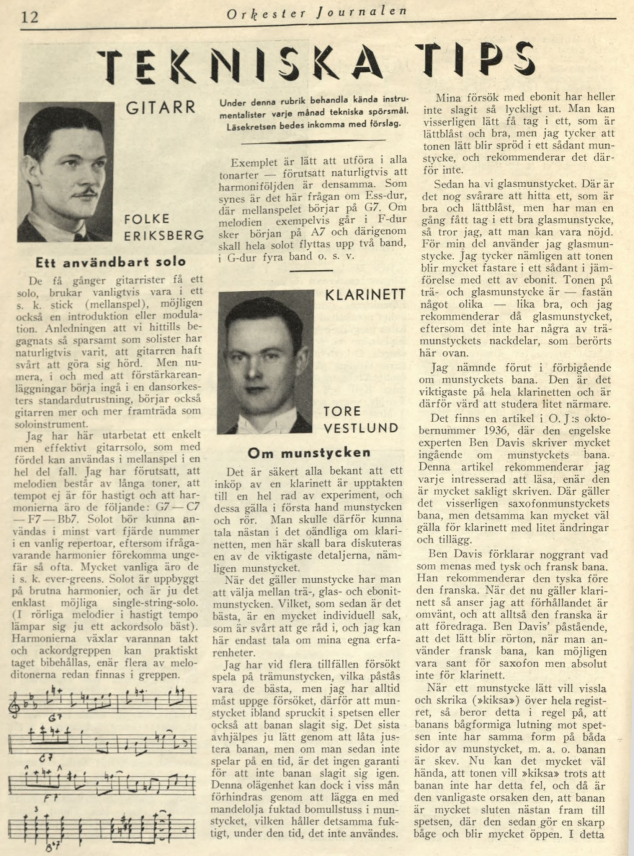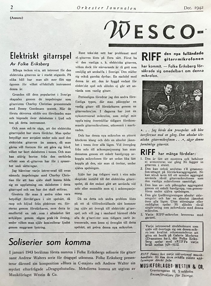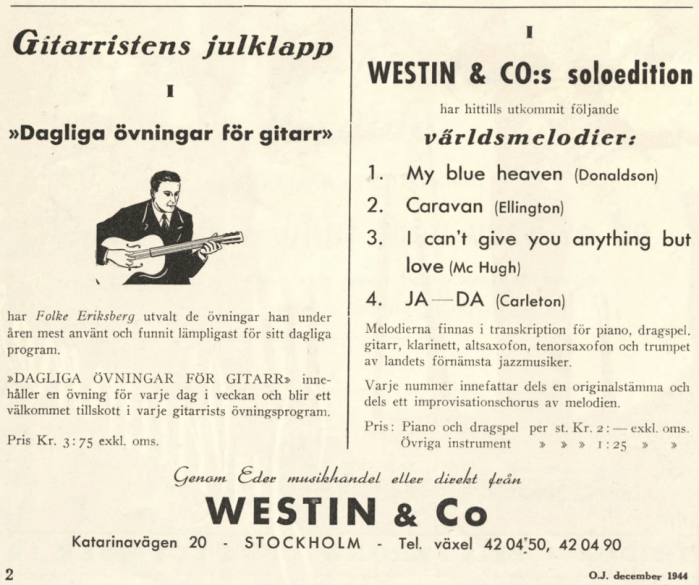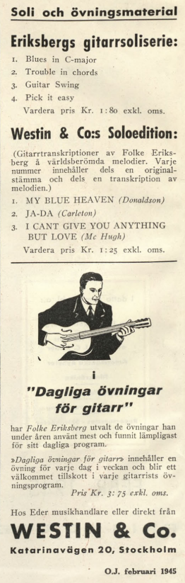 Excerpt from Swedish music magazine “Estrad”, 1939; ad for Westin prod., incl four guitar soli by Eriksberg (below), the “Daily Exercises” (above), “Orkesterjournalen” no 2 Feb 1945