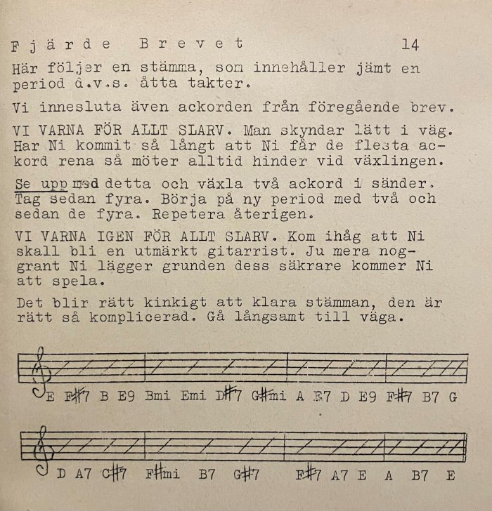 Correspondence course, Stockholm 1944! With typed text, handwritten notation! 14 pages of basic music theory, and basic guitar playing tutoring! Letter 4 of…..?