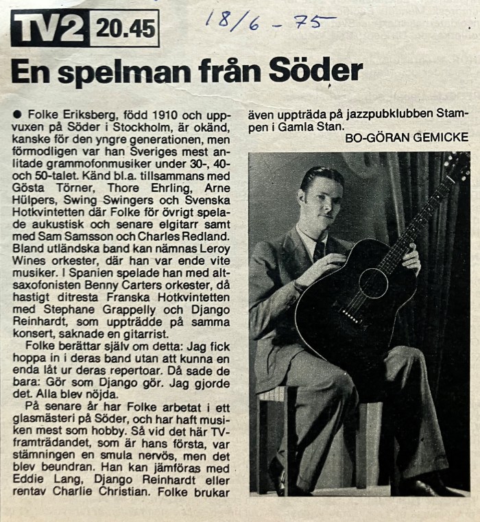 Collection of pictures, sheet music, memorabilia, of our two foremost Swedish jazz guitarists during the 1930´s and 1940´s – Folke Eriksberg & Sven Stiberg! Many of the items here were given to me by Swedish jazz guitar player Rolf Jardemark (https://rolfjardemark.com/).