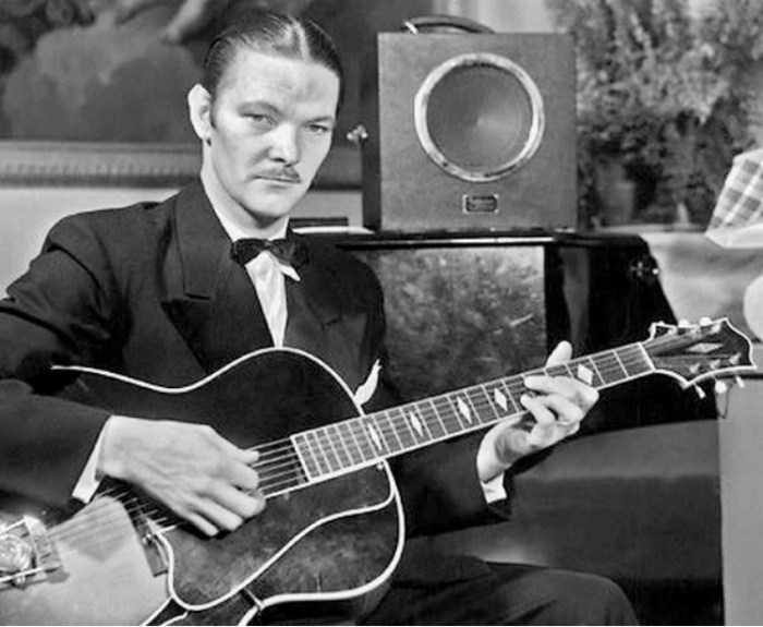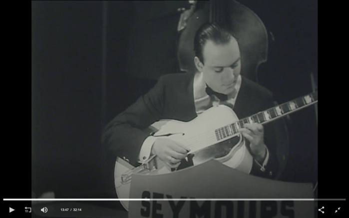 Stiberg plays guitar in a Swedish short movie (32min) with “The Seymour Sonora Orkester”. Movie: “Gatans Serenad”, 1941 (eng.”Serenade of the Street”). Stiberg is seen soloing on his Kay-Tone guitar in 7 seconds – time 13min40sec-13min47sec!