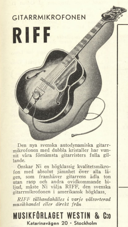 Eriksberg (1938 ad) with Levin guitar nr22, amp Centrum Goliat, guitar microphone Riff (ad below)