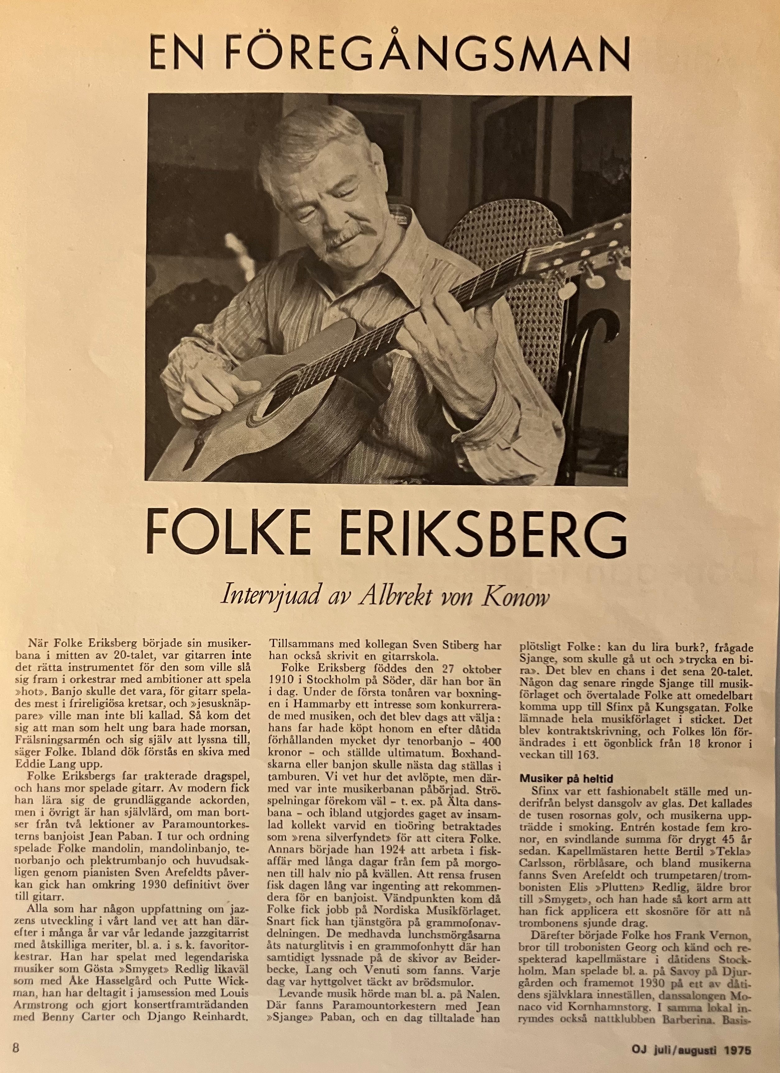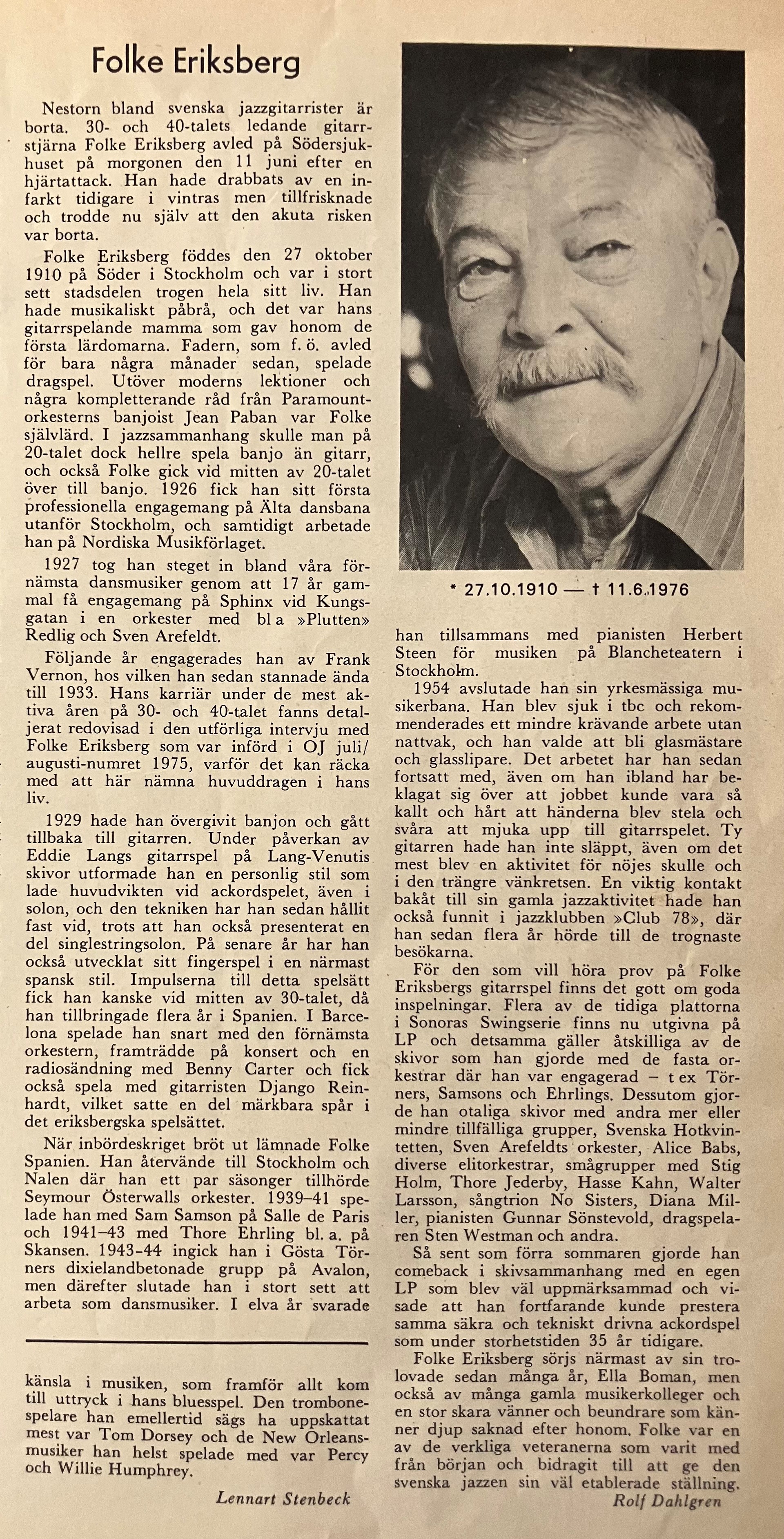 Swedish Jazz Magazine “Orkesterjournalen”, Eriksberg obituary July 1976