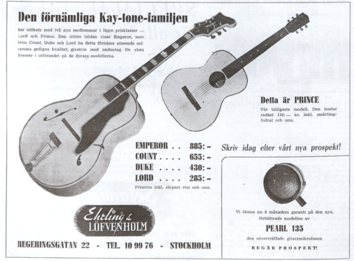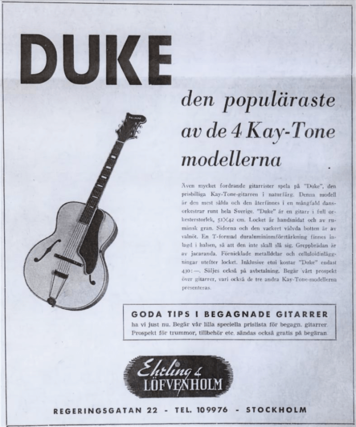 The Kay-Tone line of guitars was made by Levin during 1939-1947 for Ehrling & Löfvenholm, a music store and music publishing company formed in 1939 by famous Swedish band leader and composer Thore Ehrling and Berthel Löfvenholm (info from great homepage – link: https://www.vintage-guitars.se/)