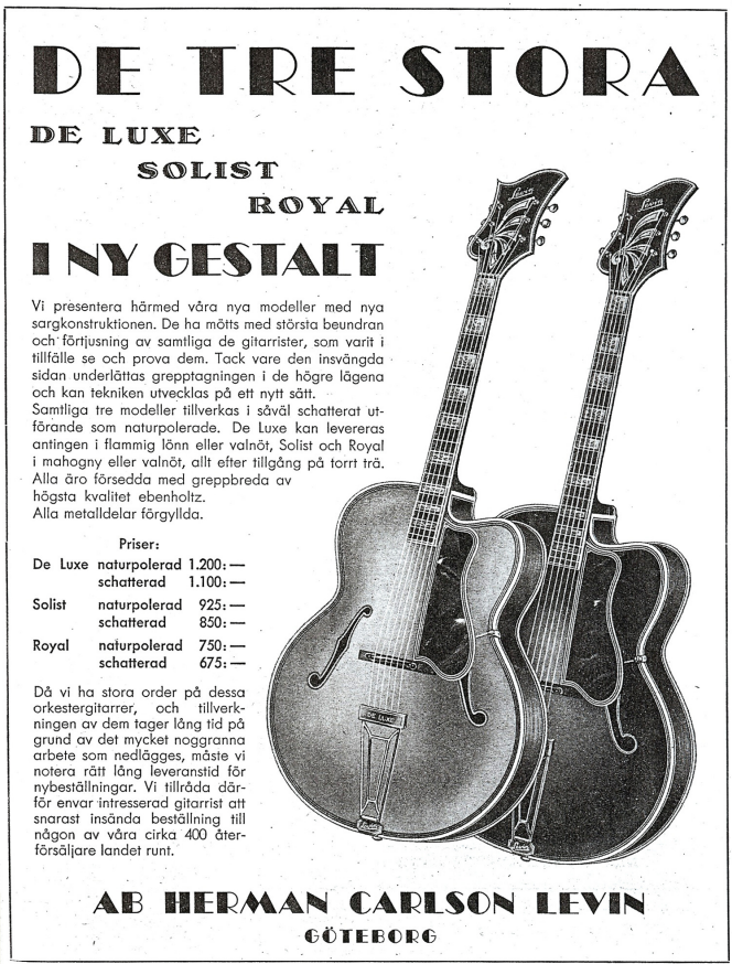Levin catalogue 1937, Levin ad 1947 (from homepage “vintage-guitars.se”), the new form (“i ny gestalt”) being archtops with cutaway!
