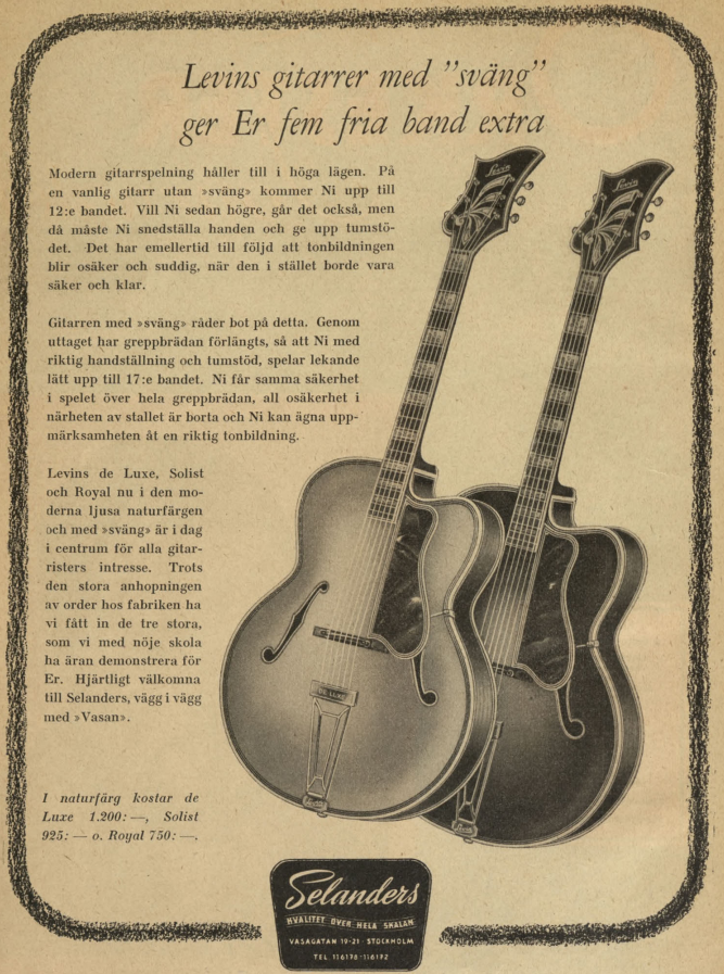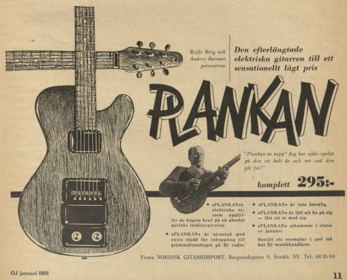 Levin guitars with “sväng” gives you five extra frets! OJ Jan-1948; “Plankan”-Solid body, 1st ad in Sweden, OJ Jan-1955!