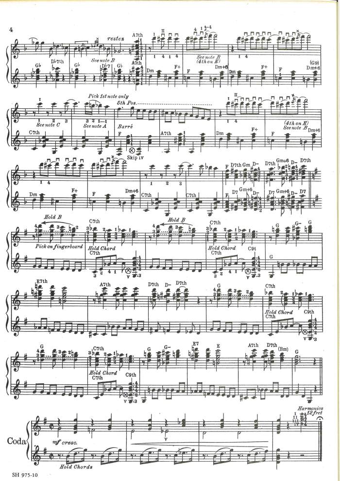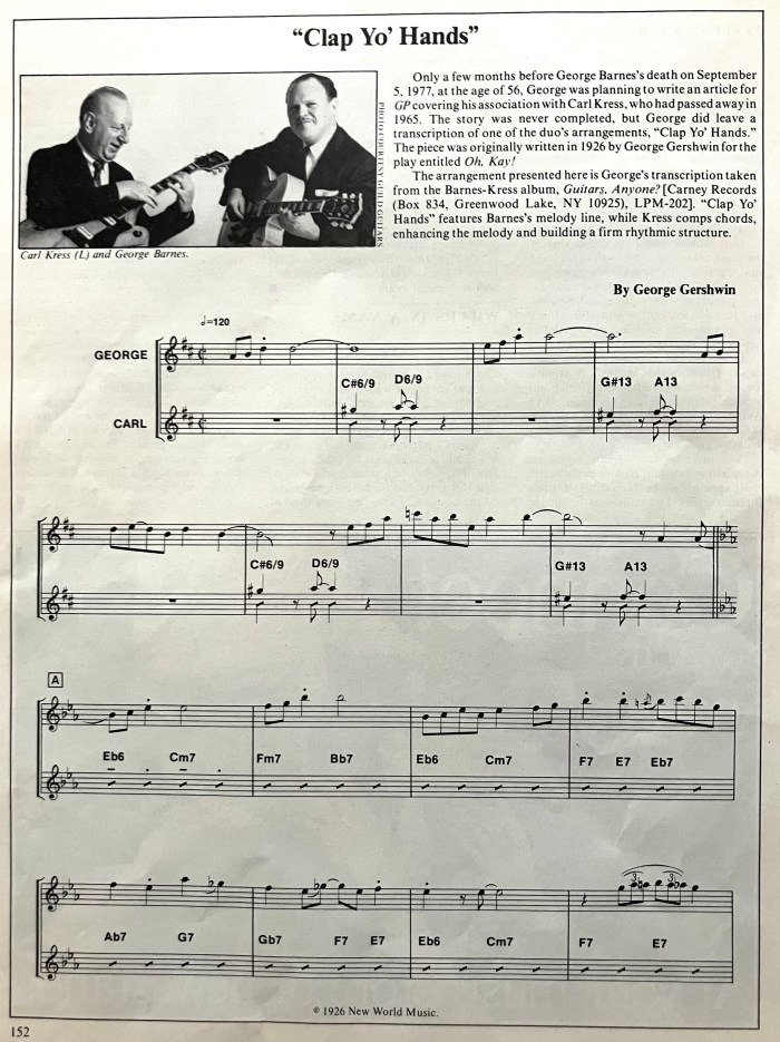Transcription of George Barnes/Carl Kress duo recording “Clap Yo´ Hands” (LP “Guitars, Anyone?”, Carney Rec., 1977). Published by the magazine Guitar Player, end of 70´s.