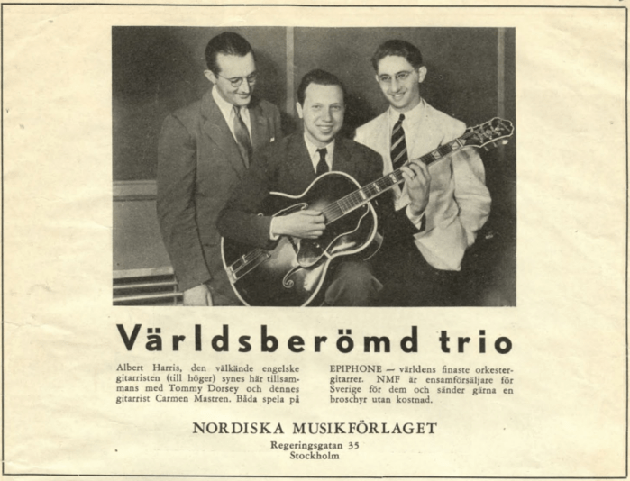 Epiphone ad, Swedish Jazz Magazine “Orkesterjournalen”, no 10 Oct 1938. A unique picture of Harris & Mastren together, the same year Harris moved from England to USA, on Mastren´s initiative!