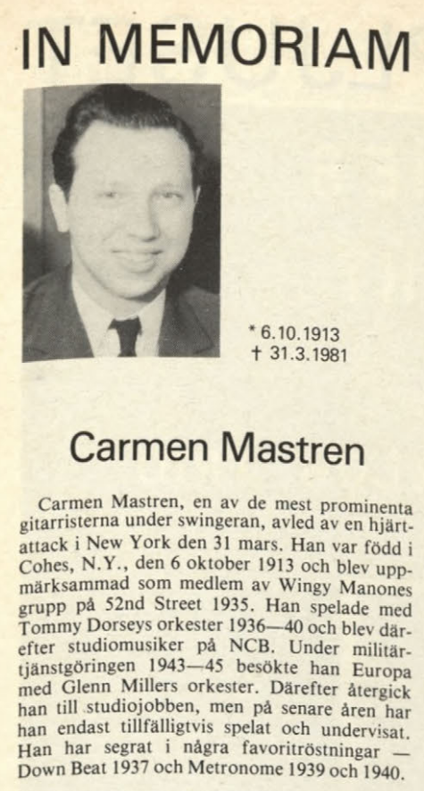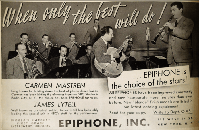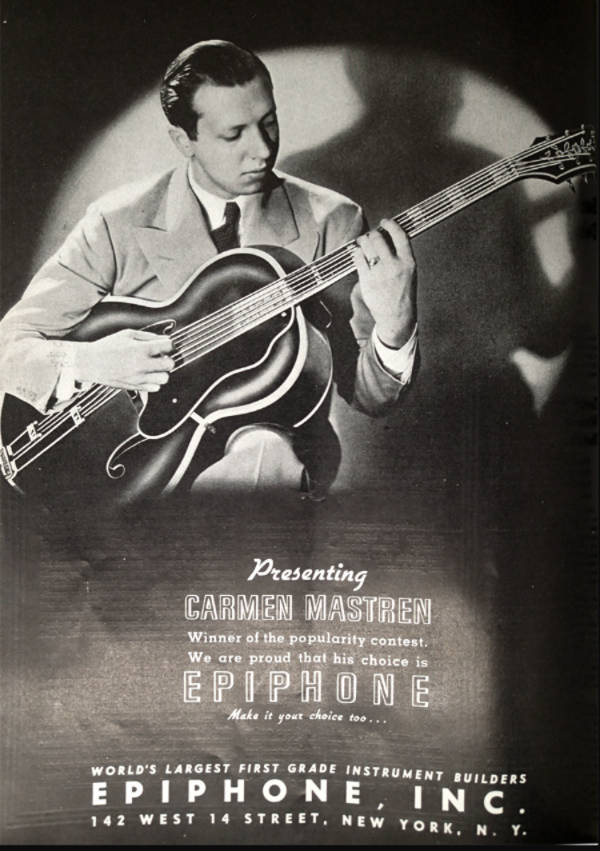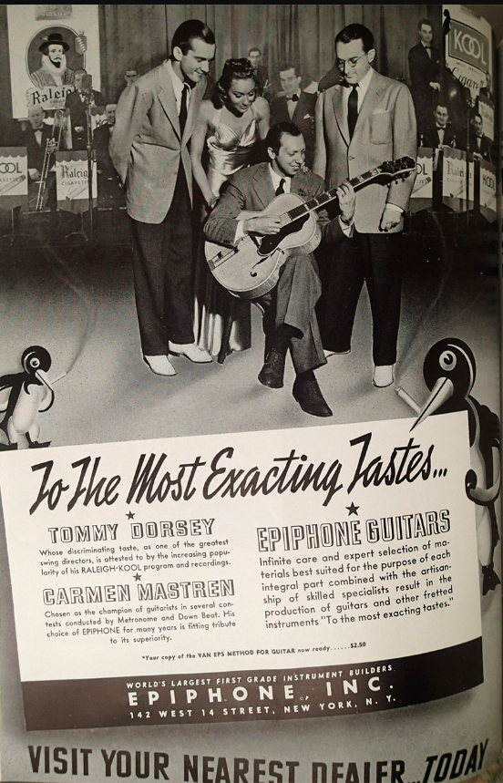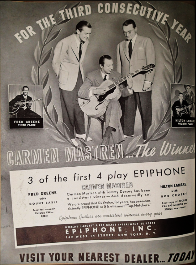 Epiphone ad, Swedish Jazz Magazine “Orkesterjournalen”, no 10 Oct 1938. A unique picture of Harris & Mastren together, the same year Harris moved from England to USA, on Mastren´s initiative! Epiphone ad, Metronome 1938