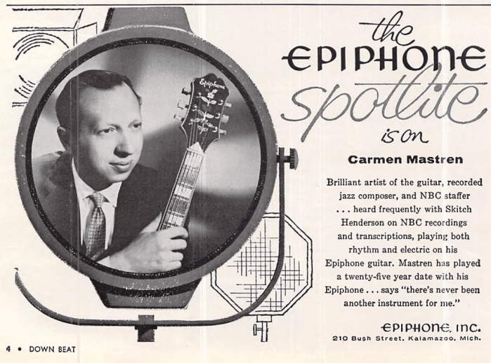 Downbeat 1961-08, Mastren Epiphone ad; obituary Orkesterjournalen May-1981